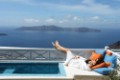 Из отеля Ellinon Thea, расположенного в потрясающем месте в Фиростефани на острове Санторини, открывается великолепный вид на Эгейское море и вулкан, выступающий из кристально чистой воды.