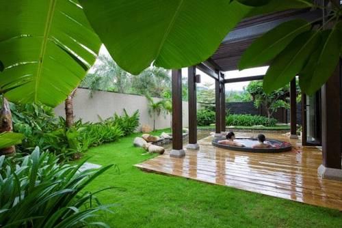 Просторные виллы открытой планировки оформлены при помощи классической деревянной мебели и тканей нейтральных тонов. Комфортабельная гостиная обставлена диванами и оснащена домашним кинотеатром. Из нее можно попасть в отдельный ландшафтный бассейн. Ванные комнаты оснащены двумя раковинами.