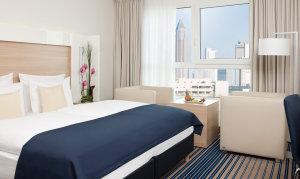 В этом современном отеле работает спа-салон с панорамным видом на Франкфурт. В номерах отеля имеется кондиционер и предоставляется бесплатный Wi-Fi. От отеля можно без пересадок доехать на трамвае до торговой ярмарки Франкфурта и центрального железнодорожного вокзала Франкфурта.