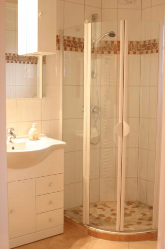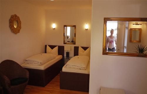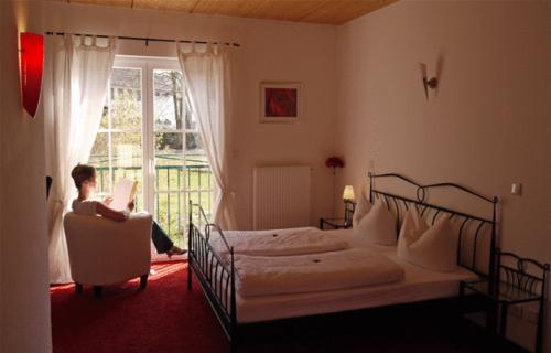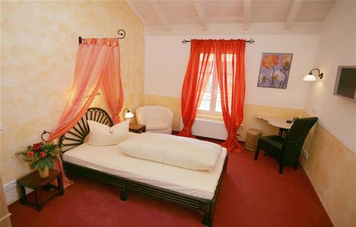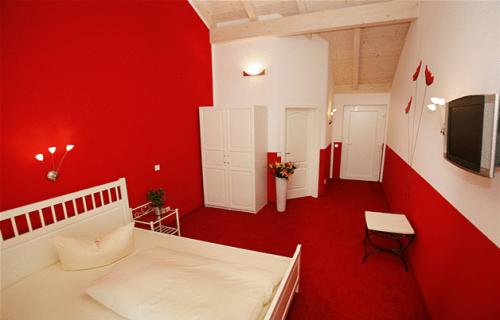 Все номера в отеле-кафе Landhaus ярко и индивидуально оформлены. В номерах есть телевизор с плоским экраном, письменный стол и ванная комната.