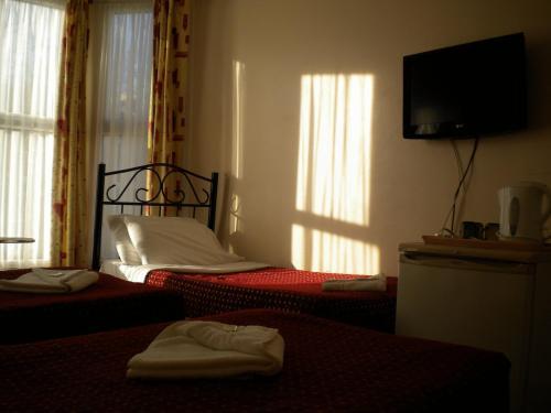 В оборудование каждого современного номера с ванной комнатой входит телевизор с плоским экраном, холодильник, принадлежности для чая/кофе, туалетно-косметические принадлежности и фен.