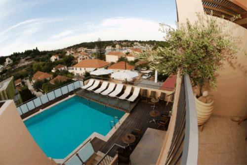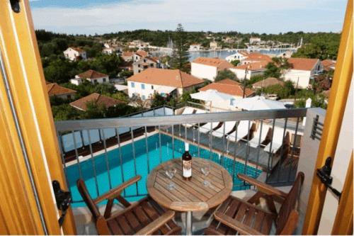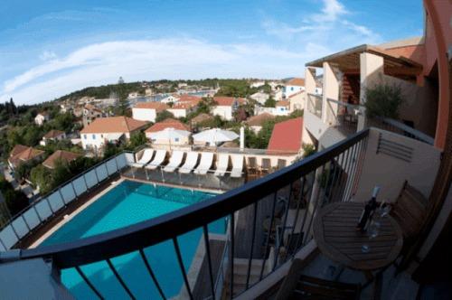 Из бассейна, наполненного пресной водой, и деревянной площадки для загара с шезлонгами открывается потрясающий вид на гавань Фискардо.