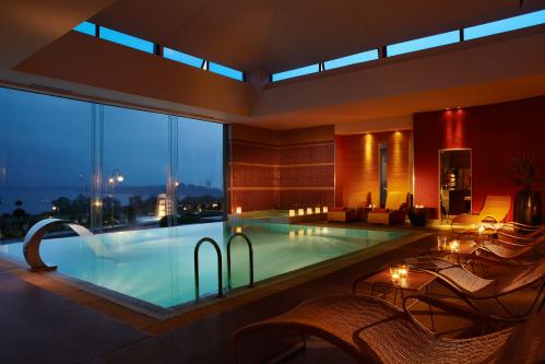 Открытые бассейны курортного спа-отеля Limneon соединяются с помощью водопада. В отеле также работает крытый бассейн. Днем гости отеля могут заказать прохладный шербет и легкие блюда в баре у бассейна, расположенном рядом с садом.