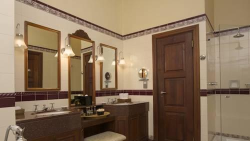 Просторные люксы с высокими потолками оформлены в классических кремовых тонах и оборудованы уютным гостиным уголком. В больших ванных комнатах установлены двойные туалетные столики и ванна.