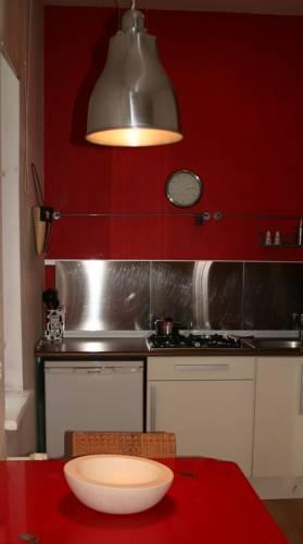 На мини-кухне установлен холодильник и плита. Бежевые шкафы контрастируют с ярко-красными стенами.